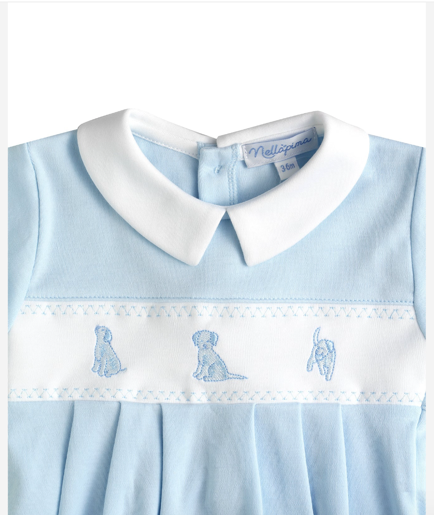 Dress your little one in timeless charm with our Blue Puppy Love Embroidery Bubble. Made from soft cotton, this long-sleeve bubble features a crisp white collar and delicate puppy embroidery across the chest. The classic bubble silhouette allows for comfort and ease of movement, making it perfect for playtime, outings, or special occasions