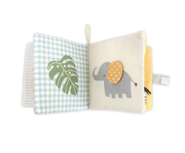 Mon Ami's Safari and Friends Soft Fabric Book takes little adventurers on a thrilling journey through the wild! With every turn of the page, your child will discover crinkly textures and playful scenes featuring a gentle lion, a towering giraffe, and a striped zebra. Soft 3D details bring these safari pals to life, while the crinkly sounds make every interaction more exciting. Perfect for little hands, this sensory-rich book is complete with a secure velcro closure, making it ideal for playtime at home or on the go.