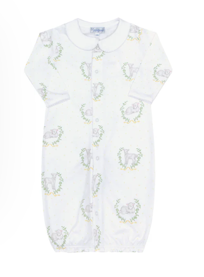 The Yellow Lamb Print baby converter gown is a true game-changer for parents! It allows for a quick and effortless transition from a cozy gown for sleepy time to a practical playsuit for playtime, simply by changing the snaps. 100% Peruvian Pima Cotton