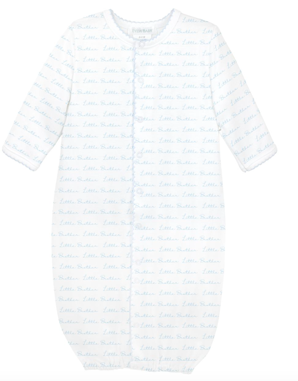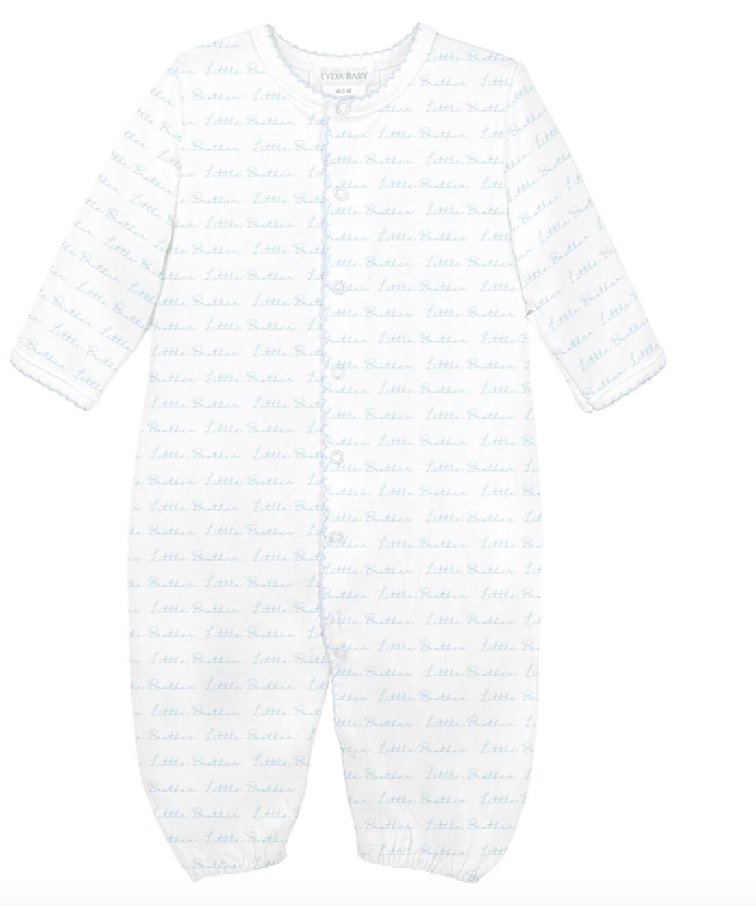 Converter gown with Little Brother in pretty script written all over - Perfect as a gown for infant and then snaps to convert to legs for the car seat or as a playsuit as baby grows taller.