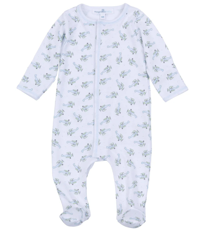 Take to the skies in comfort with this charming footie, featuring an engaging all-over airplane print. This one-piece offers full-body coziness and a playful look, highlighted by a subtle picot trim. 100% Pima Cotton